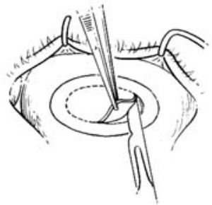 2.用显微单齿镊夹持角膜组织,可用5号圆刃刀剖切。剖切时要沿同一角膜纤维板层进行,保持均一深度(图2)。