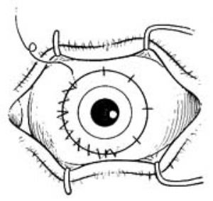 5.缝合移植片 将植片放在植床上,用10-0尼龙线间断或连续缝合于移植床上。方法同穿透性角膜移植。最后庆大霉素2万单位,地塞米松2.5mg结膜下注射。包双眼(图5)。