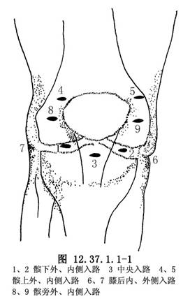 1.髌下内、外侧入路 最常用,分别在内、外“膝眼”最深处的上方2mm(图12.37.1.1-1)。屈曲膝关节45°,于外侧“膝眼”上2mm尖刀横行做0.8mm切口,尖穿刺锥向髁间窝方向刺破关节囊,改为钝穿刺锥刺破滑膜进入关节腔。内侧入路操作同外侧入路。髌前外侧入路入镜,可通过镜鞘或另建髌上内或外侧通道注入灌洗液扩张关节。内侧入路进探针等器械。检查应按顺序进行:由髌上囊开始→髌股关节面→内侧沟→内侧间室→髁间窝→外侧沟→髌上囊结束。应特别强调按序检查,以防遗漏。发现病变可照像,录像记录或进行活检。