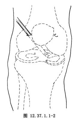 2.髌旁内、外入路 髌骨中段内或外侧旁开5mm做小切口(图12.37.1.1-2),钝穿刺锥刺入关节腔,屈膝20°~30°可较好的观察髌下脂肪垫及内外侧半月板前角。