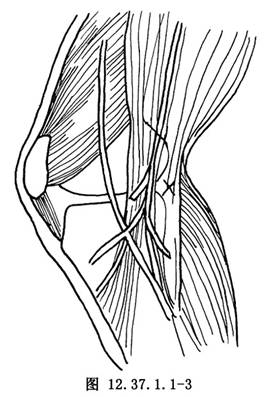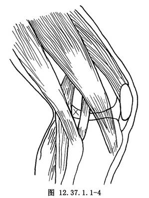 4.膝后内、外侧入路 膝后内侧入路位于股骨内髁后缘,胫骨平台后内缘以及半膜半腱肌三者构成的三角区内(图12.37.1.1-3)胫骨平台上1cm。置入70°关节镜可观察到后交叉韧带及内侧半月板后角;膝后外侧入路位于外侧关节间隙,髂胫束的后缘与股二头肌的前缘之间(图12.37.1.1-4),可观察到外侧半月板后侧边缘、腘肌腱、部分前交叉韧带。建立此二入路时应首先扩张关节,屈膝90°位,先用套管针穿刺定位,拔除针芯有液体流出,表明确在关节内后方可改为钝穿刺锥刺入,禁止使用暴力以免损伤软骨面。另外穿刺锥方向宜稍向前倾以免损伤腘窝血管神经。
