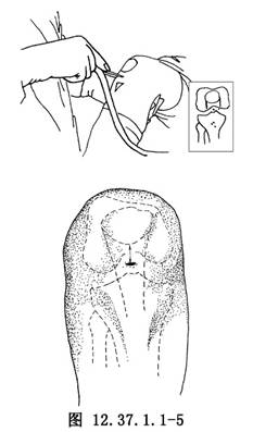 5.中央入路 屈膝90°位,在髌韧带中线,髌骨下极下方1cm处做皮肤切口(图12.37.1.1-5),尖穿刺锥穿透髌韧带并上下扩大,改为钝穿刺锥向髁间窝方向刺入,可观察到内外关节间隙,通过髁间窝进入后关节腔,用70°镜检查后关节囊,也较常用于进行半月板整块切除时进半月板钳牵引固定半月板用。