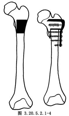 在股骨前外侧缘用骨刀凿一痕迹作为矫正旋转畸形的标记。按术前设计用电锯截除骨段,注意保留包括小粗隆在内的内侧骨皮质(图3.20.5.2.1-4)。去除骨段后,将其远端上移,按需要调整旋转角度,再用直角钢板或髋关节螺钉加压内固定。