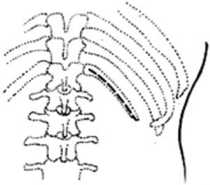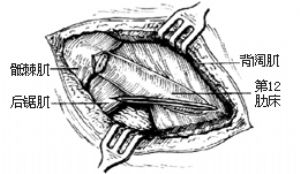 2.切开 从胸12腰1椎棘突平面之间向腋后线作一斜行或弧行切口[图1-1]。切开皮肤、皮下组织、拉开背阔肌和下后锯肌(必要时可以切断),显露并在骨膜下切除部分第12肋骨。在剥离骨膜时,注意肋骨上缘和内面,以免损伤胸膜。切除肋骨后,在平第1腰椎棘突平面切开第12肋骨内面骨膜,缝扎肋间血管,显露深层的膈肌,将膈肌在脊柱的附着部切开,即为肾周围脂肪囊的上区[图1-2~3]。将肾周围脂肪作钝性分离,即见肾包膜的后壁。