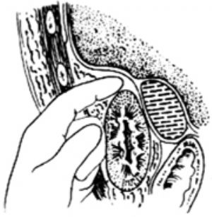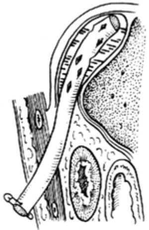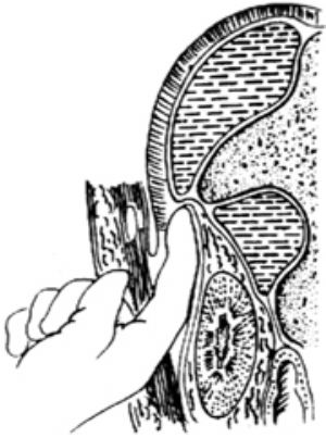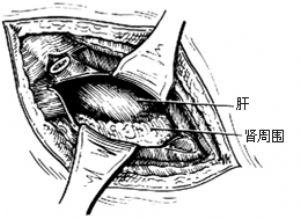 3.引流 用手指探查脓肿部位,如为肝上间隙,脓肿偏上,可用手指将腹膜从膈面剥下,向上分离[图1-4];如为肝下肾前,可在肾上极之前向下分离[图1-5]。然后,再试验穿刺[图1-6],如抽得脓液,即可沿穿刺针切开。切开后用止血钳分离脓腔,再以示指伸入脓腔分开纤维隔,以利充分引流。脓腔内放入2~3条香烟引流,如脓腔较大,则可用软胶管引流[图1-7]。