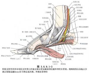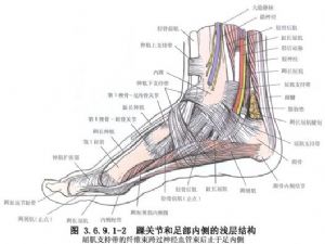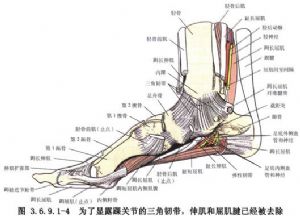 将趾长屈肌与胫后肌的肌腱牵向后外方。显露关节囊,同时显露三角韧带,该韧带由两部分组成,浅部呈扇形,深部较短而厚。浅部多在内踝尖或中部撕裂,深部常在距骨内侧面撕裂。