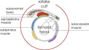 肩袖由前方的肩胛下肌(止于肱骨小结节),上方的冈上肌(止于肱骨大结节的上部,superior facet),后方的冈下肌(止于肱骨大结节的中部, middle facet)和小圆肌(止于肱骨大结节的下部, inferior facet)构成。它们在接近止点的位置与关节囊相愈着并相互融合形成袖套样结构包绕在盂肱关节的周围。