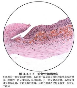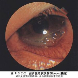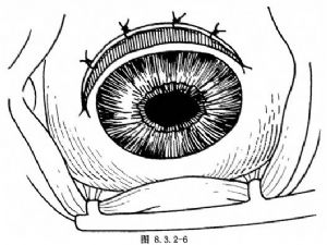 3.将巩膜面伸入角膜的浅层血管末梢及其分支烧灼。用7-0丝线将球结膜游离缘固定在距缘部3~4mm处的浅层巩膜上(图8.3.2-6)。
