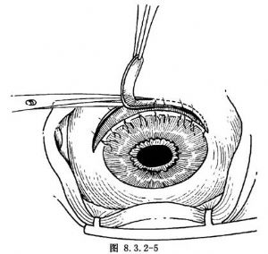 1.用剪刀在距角膜缘3mm处做一与角膜缘平行的结膜切口,长度占角膜周长的1/4~1/2,深达巩膜(图8.3.2-4)。