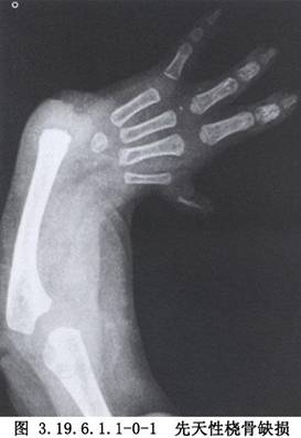 矫正桡骨缺损的腕关节成形术用于先天性桡骨缺损的手术治疗。先天性桡骨缺损又称轴旁性桡骨半肢畸形,较为多见,半数以上为双侧,单侧者以右侧居多,男性多于女性。主要临床表现为前臂短,腕关节向桡侧偏斜、不稳定,故有桡侧拐状手之称。本病除桡骨完全或部分缺损外,有时并发拇指、腕、掌诸骨发育不良或缺损及同侧尺骨弯曲粗大。可并发其他部位的畸形,前臂肌肉、肌腱、神经、血管的缺如或畸形也经常存在(图3.19.6.1.1-0-1)。