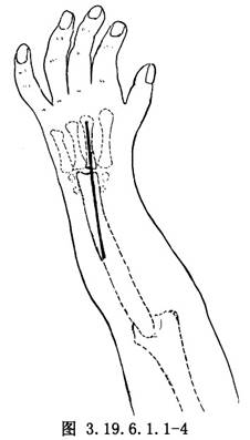 游离并向桡、尺侧牵开伸指总肌腱和尺侧伸腕肌腱,横行切开关节囊和其他挛缩软组织,显露尺骨远端和腕骨,松解腕骨,去除头状骨和月状骨可以相对获得一些长度,以利纠正桡偏,复位尺腕关节(图3.19.6.1.1-3)。尺骨远端不予缩短以保全其骨骺,将尺骨远端嵌入于去除月状骨和头状骨后形成的骨槽内,矫正桡偏置于中立位、腕背屈25°,用1枚克氏针从第3掌骨远侧穿入,经腕部至尺骨髓内固定(图3.19.6.1.1-4)。重叠缝合紧缩尺侧关节囊,其他部位关节囊亦予重新附丽于腕骨骨膜,以维持良好对位。复位后尺侧伸腕肌变得松弛,经缩短后缝合。