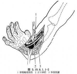 切开皮肤、皮下组织,游离皮瓣,显露腕关节的背侧、桡侧和尺侧。切除腕桡侧所有紧张挛缩的纤维束,紧张的肌腱应做延长而不切断,但如向远侧跟踪探查,该肌腱已无功能,则可切断该肌腱(图3.19.6.1.1-2)。正中神经表浅而紧张,注意勿损伤或误作肌腱而切断。