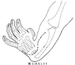 腕背正中做S形切口。从第5掌骨背侧开始,经腕背横纹转向前臂背侧(图3.19.6.1.1-1)。