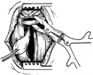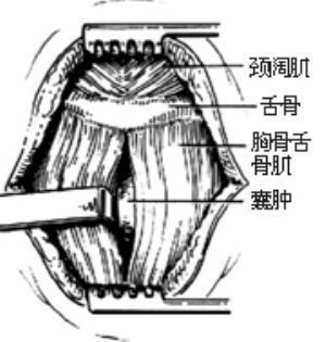 一般情况下,先分离囊肿下方,将其与甲状腺组织分开;用组织钳提起囊肿,继续分离囊肿两侧,即可见一纤维带连至甲状腺峡部;再向上分离,可看到纤维带穿过舌骨或在其后方向上延伸。