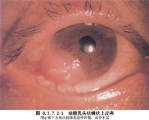 结膜上皮癌多见于50~75岁,男性多于女性,眼部原有损害、维生素A缺乏及眼球摘除术后等均可成为本病诱因。肿瘤好发于睑裂区角膜缘附近,即暴露于空气、阳光的部位和易受伤的部位。以颞侧角膜缘为多见,其次为泪阜及睑结膜,也可发生于穹隆部结膜。肿瘤肥厚,无蒂,呈橙红色肉芽状,看起来似乎生长在角膜,实际上只是肿瘤遮盖了角膜。肿瘤表面常有皲裂,其间常出血。乳头状型者较硬,表面呈类似石榴子样乳头。发生于角膜缘整个圆周时,则形成环状。发生于泪阜时则呈囊肿样,属于皮脂腺瘤型。