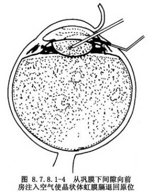 6.向前房注入消毒空气(平衡盐液)加深前房,使虹膜-晶状体隔退回原位。