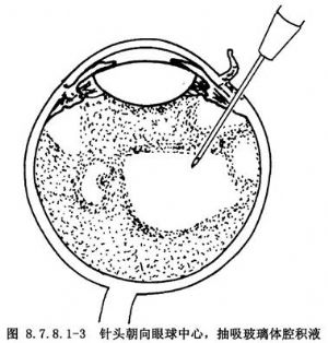 4.用一次性的2ml或5ml注射器,在针头12mm处做一标记,通过切口向眼球中心缓缓刺入,一边向前移动一边轻轻抽提针栓,造成空针内少许负压,但注意不要形成太大负压。吸到液化腔或液化玻璃体时,手中针栓有落空感,吸出液体0.8~1ml即可。如抽不出积液,将针头前后左右略略移动,一般均可顺利吸出,注意不要损伤晶状体和视网膜。