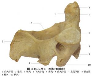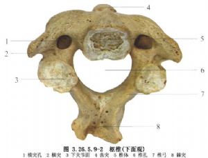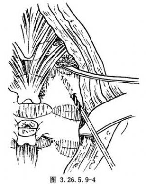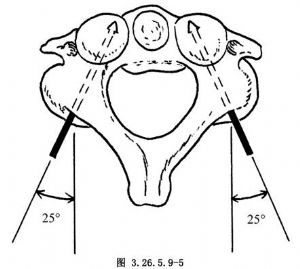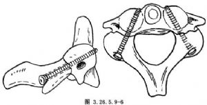 1.后正中入路显露上位颈椎的后部结构。以颈2、3关节确定颈2侧块的位置。在影像增强器监视下,将两根1.2mm的克氏针,经颈2关节侧块的中点,以平行颈2~3小关节面的方向钻入外侧突。可用一细的剥离器插入小关节内(图3.26.5.9-4),以协助确定克氏针钻入的矢状面方向。在水平面,克氏针应与中线成15°~25°。用剥离器标记出颈2椎板及峡部的内侧骨皮质,以确定克氏针钻入的水平方向(图3.26.5.9-5)。