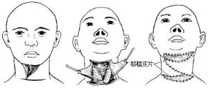 切除瘢痕组织要彻底,两侧切口尖端超过颈部侧中线,然后取与创面等大的中厚皮片整张移植于创面上[图1]。甲状软骨部位可在局部贯穿缝合几针,以防术后吞咽动作影响皮片成活。最后作包裹包扎。