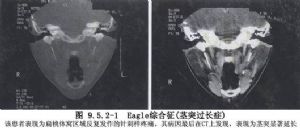 茎突过长症亦称茎突综合征(styloid syndrome),1937年由Eagle首先报道,故命名为Eagle综合征(图9.5.2-1)。本病并不少见,病因较为复杂,但主要是茎突过长,系在发育过程中,茎突发生异常骨化所致。茎突位于颞骨岩部的底面,起自茎乳孔的前内方,呈细长、骨柱状,其远端伸向内侧及前下方(图9.5.2-2)。正常茎突长度约为2.16~2.52cm,当茎突过长时,因其末端伸展到达的区域不同,而引起不同的症状。本病多见于成年人,症状大多起始缓慢,病史长短不一,自数日、数月至数年不等,临床表现也各有不同,较易漏诊。常见的症状有:
