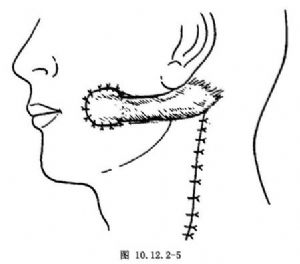 3.转移皮瓣并修复缺损区,蒂部根据情况可缝合成管状,供皮区潜行分离后,可直接拉拢缝合(图10.12.2-5)。3周后断蒂,修整创缘,多余的皮肤缝回原处。