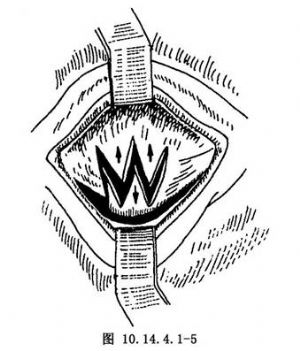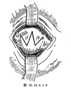 4.眼科医生为了保护眼球,采用加长上睑提肌肌腱的方法(图10.14.4.1-4,10.14.4.1-5)。即在睑褶皱处作切口,将上睑提肌肌腱作锯齿形切开,然后加以分离、加长。