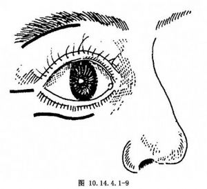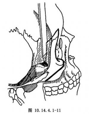 在外眦联合之外作一横切口,长20~25mm,深达骨膜,向外达颞筋膜(图10.14.4.1-9)。在颧后凹处作骨膜下潜行分离。在颧额缝平面,横行切断颞肌前部,长2cm。在眶内,沿眶外侧壁作眶膜下分离,向下达眶下裂。