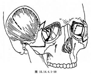 1.神经外科医生曾去除眶顶,使眼眶向额窦或翼点(颧、顶、颞骨与蝶骨大翼交接点)扩大(图10.14.4.1-1)。