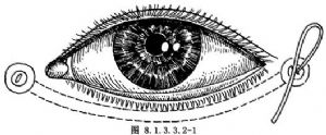 附:①如果病人并有眉毛下坠,可于上述手术完毕后,加做眉毛复位手术。在眉毛上面额部拉起眉毛至原位,多余的额部皮肤即成皱褶,将这多余的皮肤切除,拉起眉毛缝回于眶骨缘骨膜,使眉毛回复原位。要注意与对侧眉毛位置相称。②注射麻药加入透明质酸酶的目的,是使麻药渗透扩散,不致眼睑水肿。③内眦部做切口时注意不要伤及泪小管及泪囊,可插入泪囊探针,以示位置。④外眦部条带以尼龙线结扎,要深达眶骨缘骨膜,才能固定。