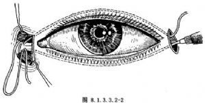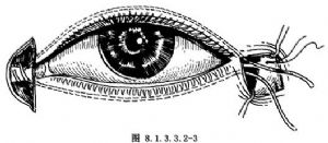 5.将阔筋膜条带另一端穿过柳叶刀小孔,反抽柳叶刀,使阔筋膜条带顺睑皮下隧道穿至外眦角切口,并由此穿出。反复抽紧阔筋膜条带,至下睑睑缘贴紧眼球处于正常位置。然后将阔筋膜条带缝结于外眦韧带,缝线要深达眶骨缘骨膜,以求固定,结扎。对单是下睑外翻的病例,至此手术便可终结(图8.1.3.3.2-1)。如果是上睑闭合不全的病例,仍需作以下手术步骤。