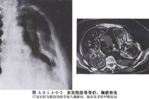 单纯肋骨骨折如未合并严重胸内脏器损伤,多不严重。疼痛是主要的临床表现,疼痛随呼吸、咳嗽及喷嚏而加重。常因疼痛不敢深呼吸及咳嗽,易使呼吸道分泌物潴留,引起肺部感染。骨折刺破胸膜和肺组织可发生气胸、血胸或皮下气肿及咯血。骨折处明显压痛,有时可触到骨折断端或可听到骨擦音。前后挤压胸廓,可引起胸壁疼痛,且与局部压痛点一致,为间接压痛阳性。X线检查不仅可以观察骨折情况,而且可以了解有无合并胸内脏器伤。如果肋骨骨折无明显移位,或肋骨骨折位于肋骨与肋软骨交界处,X线胸片上难以看出骨折线,可行超声检查或待3~6周后X线复查看见骨痂阴影。CT扫描对合并肺挫伤、肺内血肿及肺裂伤具有特殊的诊断价值。肋骨骨折的诊断并不困难,但应仔细全面检查,注意有无血胸、气胸及合并其他部位的损伤。X线检查应重复进行,以及时发现延迟性血胸、气胸、肺不张及肺部感染等(图5.9.1.1-0-1~5.9.1.1-0-3)。