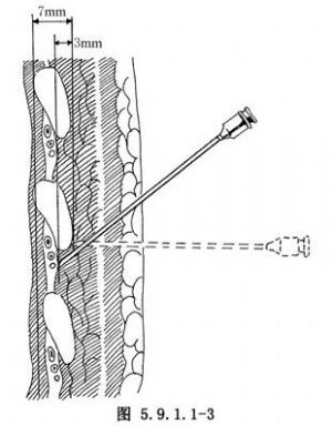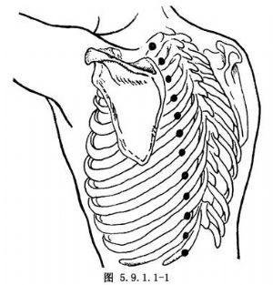 2.肋间神经封闭 在肋间隙对肋间神经行药物阻滞注射止痛。因肋间神经与其上、下肋间神经有分支交叉重叠,故封闭时必须上、下各超过一个肋间,才能取得满意的止痛效果。封闭的部位可在脊椎旁(肋骨角)、腋后线、腋前线或胸骨旁等处。椎旁封闭点在脊椎旁5cm处,因该处肋间神经相对恒定,体表标志清楚,封闭注射较准确,效果较好。