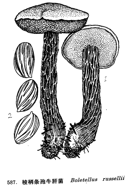 子實體中等或稍大。菌蓋直徑8-9(13)cm,半球形至中央凸起,邊緣內卷表面乾燥,有絨毛後呈鱗片狀,淡褐黃色或淡粉紅色。菌肉帶淡黃色,受傷時不變色。菌管直生或在柄周圍凹陷,淡綠黃色或橄欖綠色,受傷時不變色。管口大,呈角形,寬1-2mm。菌柄長8.5-10(18)cm,粗1-2cm,圓柱形或向下漸細,常在基部彎曲,內實,紅褐色,具粗糙網棱。孢子印暗橄欖色。孢子橢圓形至卵圓形,有縱棱,淡黃褐色,16-21μm×8.5-12μm。側囊體棒形或其它形狀,30-50μm×8-11μm。圖例