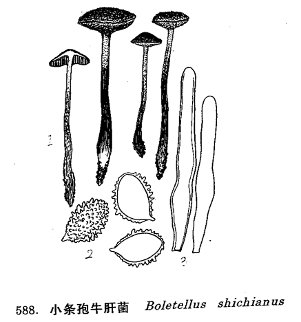 圖 588 小條孢牛肝菌 : 1. 子實體, 2. 孢子, 3. 囊體