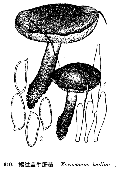 子實體一般中等大。菌蓋表面褐色,具細絨毛,受傷後變藍色,直徑6-18cm,扁半球形,後期近平展、褐色且中部色深呈醬色或茶褐色,溼時粘,被細絨毛。菌肉白色至黃白色。菌柄圓柱形,稍彎曲,長4-8cm,粗1-2.5cm,淡黃褐色,上部色淺,菌管凹生,多角形,每毫米1-2個管孔,黃色後變綠黃色。孢子青褐色,長橢圓形,光滑,含一油滴,11-15μm×4-5.5μm。有管側囊體,稀少。圖例