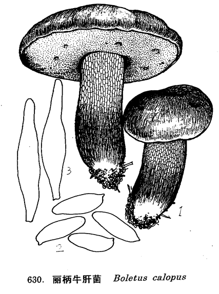 圖 630 麗柄牛肝菌 : 1. 子實體, 2. 孢子, 3. 褶緣囊體