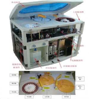 全自動生化分析儀的結構一般按吸收池的型式分爲分立式和流動式;按單色裝置分爲濾光片式(干涉濾光片或吸收濾光片)、光柵式、固體發光器件或其他等效方式;按光路型式分爲前分光和後分光;按比色容器類型分爲循環使用式和一次性使用式。儀器組成一般由光電比色部分、進樣系統、控制單元、數據處理系統、清洗系統等組成。產品圖示舉例: