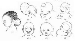 颅裂好发于颅骨的中线部位,颅顶及颅底均可发生。以枕部多见,也见于额顶部;颅底部者可自鼻根部、鼻腔、鼻咽腔或眼眶等部位膨出。个别病例可向侧方膨出,如位于颞部(图4-46)。