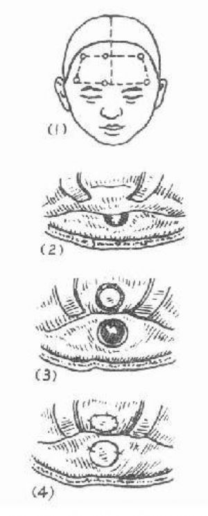 手术方法可以从颅外与颅内进行,颅外法适用于枕部、顶部膨出及个别的鼻根部骨缺损较小的病例;颅内法主要用于颅底鼻根部、鼻咽部或眼眶部膨出(图4-48,49)。或采取联合手术。