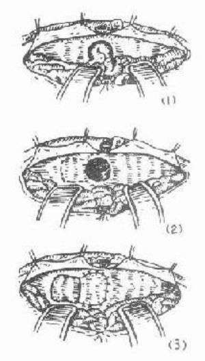 手术的目的是切除膨出包块,包括可能切除的囊内容。将硬脑膜缺损及软组织缺损修补,这是手术中的重要步骤,颅骨缺损一般可不做修补,但某些部位如鼻额部骨缺损、眶距过宽,可以手术矫正。