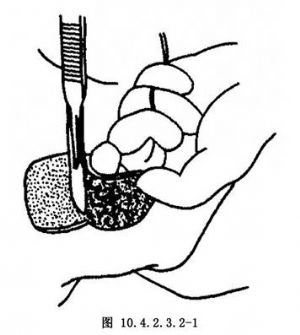 3.用尖刀片切开全皮质。先在皮质的尖端缝合1~2针作牵引固定,而后边切开边向后翻转皮层,尽可能不带脂肪。如有脂肪,可在皮片完全取下后再行修去(图10.4.2.3.2-1,10.4.2.3.2-2)。