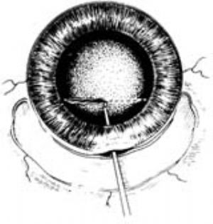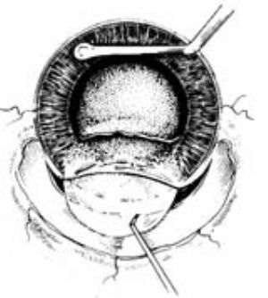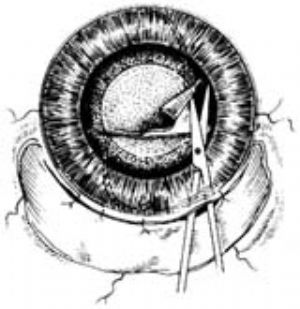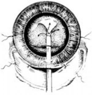 1.一字形截囊,其位置尽量靠近上方赤道部,尔后游离晶状体核(图1)。