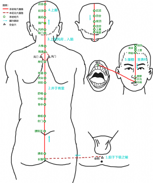 《铜人腧穴针灸图经》:治目睛痛不能远视,面赤目黄头肿,可灸七壮,亦不可妄灸,令人失音。