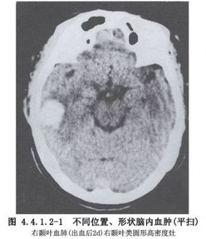 皮质下血肿或脑叶血肿在高血压性脑出血中约占15%,以额叶、颞叶、顶叶为多见。应注意与动静脉畸形或其他原因所致的脑内血肿相鉴别。CT扫描可以确定其部位和大小。如血肿<30ml,临床症状稳定,可行保守治疗观察,许多病人可吸收自愈。但如观察过程中症状加重,或血肿量在30ml以上,颅高压症状明显,应考虑手术治疗。此类血肿死亡率较低,早期清除血肿,有助于脑功能恢复(图4.4.1.2-1)。