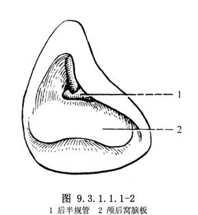 内淋巴囊窝位于后颅窝的前壁,颞骨岩部的后面,乙状窦的前内侧有一骨性裂隙称内淋巴囊裂隙,裂底有一小孔即前庭小管外口,通向前上而略偏向内方的骨性小管内口在前庭内壁椭圆囊隐窝下方,其中有膜性内淋巴管,系沟通内淋巴囊与球囊、椭圆囊的通道,内淋巴囊位于岩部后面两层硬脑膜之间,呈梨形,底部宽,顶部狭窄,可分为近侧部、中间部和远侧部。在乳突根治术术腔完成后,打开颅后窝脑板即可找到内淋巴囊,其前方为面神经垂直部,后方为乙状窦,上方为后半规管,下方为颈静脉球。上下径平均8.9mm;前后径平均9mm,从外半规管到内淋巴囊的下缘14~19.5mm,平均17.5mm(图9.3.1.1.1-0-1A、B)。