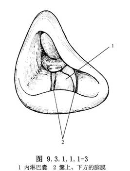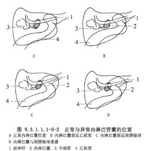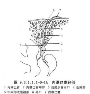 梅尼埃病病人内淋巴囊也有很大变异,很少见到第1型内淋巴囊,病程较长者内淋巴囊较小位置较低,前庭水管较短而直。乳突气化不良者,乙状窦前移,颈静脉球较高,病程越长,内淋巴囊壁越厚,囊腔越小,手术越困难。