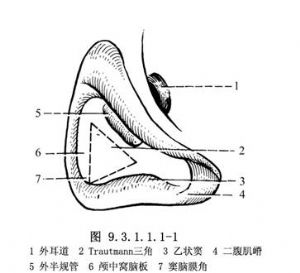 1.按“单纯乳突凿开术”步骤在鼓窦暴露后,磨除乳突气房,使乳突腔轮廓化后,认清外半规管、乙状窦和颅中窝脑板、窦脑膜角。在乳窦腔天盖、乙状窦和半规管之间为Trautmann三角区,在此三角深面为颅后窝脑膜。向下磨除乳突尖气房,暴露二腹肌嵴,完成“单纯乳突凿开术”(图9.3.1.1.1-1)。