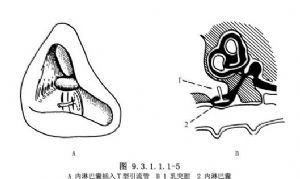 5.留置T型硅胶管 在内淋巴囊外壁纵行切开处插入T型硅胶管,一端突出在乳突腔(图9.3.1.1.1-5),形成永久性瘘管,过多的内淋巴液流入乳突腔,以达引流和减压的目的。