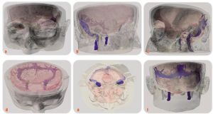 通过术前将详实的影像学资料进行虚拟三维重建,实现脑组织、听小骨、听位器、占位、耳蜗、静脉、面神经、颅骨、皮肤的3D构象图,可进行全方位观察。(a:主视图;b:左视图;c:右视图;d:俯视图;e:仰视图;f:后视图)