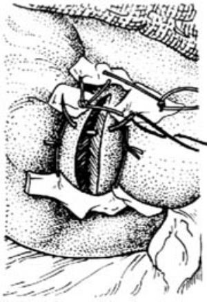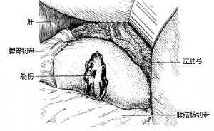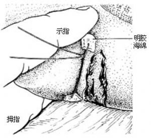 3.对于表浅的裂伤(伤口在2cm以内),可用1-0~2-0号铬制肠线或7-0号丝线缝闭。对于较深的创口,可先作与创缘平行并深达创底的间断u形缝合,再间断缝闭创口。创腔内可填塞带蒂的大网膜或明胶海绵块,以帮助止血和结扎时减张[图1]。